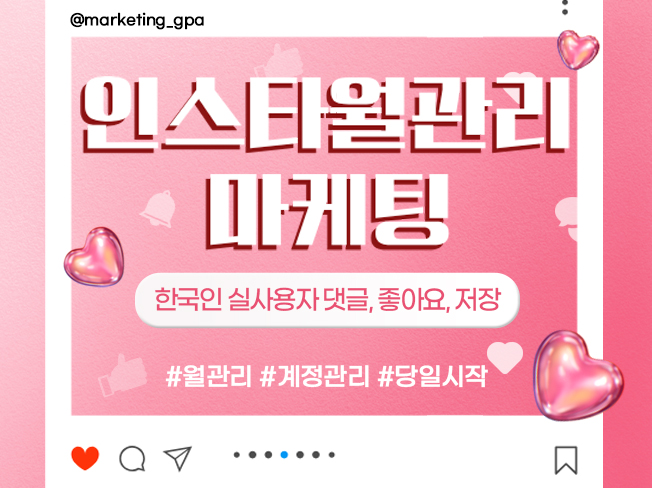 인스타 운영이 어려운 분들을 위해 인스타 좋아요, 댓글, 저장, 팔로우 등 안전하고 빠르게 마케팅을 도와드리겠습니다.